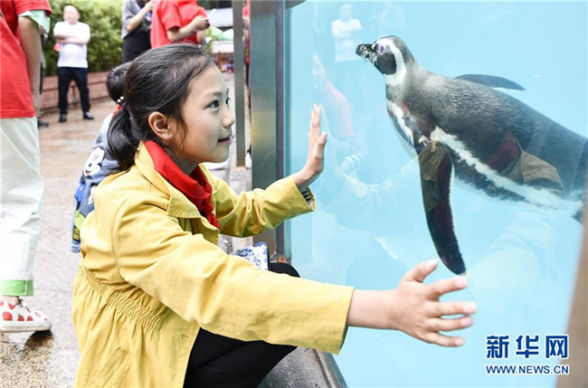 5月29日,在重慶市動物園內(nèi)的互動區(qū),蓼子鄉(xiāng)第一中心小學的馬嬌陽在觀賞企鵝。新華社記者 劉潺 攝