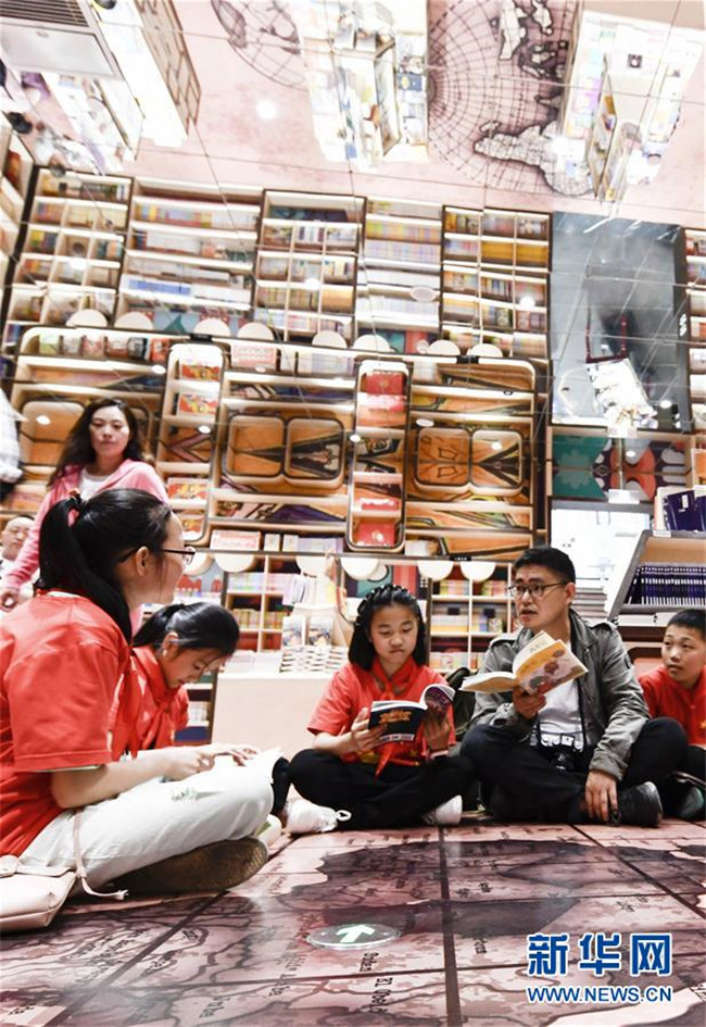 5月29日,在重慶市九龍坡區(qū)一家書店內(nèi),重慶鐵路小學的老師鄧賢莎(右二)和蓼子鄉(xiāng)第一中心小學的學生一起讀書。新華社記者 劉潺 攝