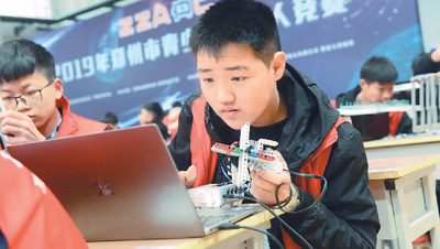 3月31日,2019年鄭州市青少年機(jī)器人競(jìng)賽首次將線上創(chuàng)意編程比賽納入競(jìng)賽中。圖為選手在比賽前編程。張 濤攝(人民視覺)