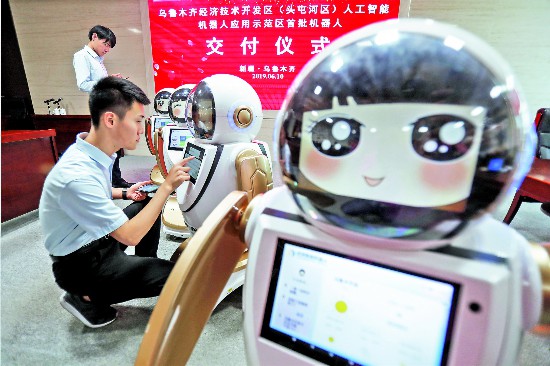6月10日,在烏魯木齊經(jīng)濟技術(shù)開發(fā)區(qū)(頭屯河區(qū))維泰大廈,新疆創(chuàng)澤機器人科技有限公司工程師在調(diào)試機器人“創(chuàng)創(chuàng)”。 當日,該公司生產(chǎn)的75臺人工智能機器人正式交付經(jīng)開區(qū)(頭屯河區(qū))政務服務、社區(qū)、學校等場所,這也標志著烏魯木齊經(jīng)開區(qū)(頭屯河區(qū))國家級人工智能機器人應用示范區(qū)正式啟動。(謝龍)
