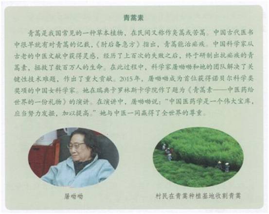 小學(xué)《道德與法治》教材五年級(jí)上冊(cè)“驕人祖先 燦爛文化”單元中,也對(duì)屠呦呦的事跡進(jìn)行了簡述。人教社負(fù)責(zé)人談到,該單元指出我國古代科學(xué)獨(dú)具特色,其中中醫(yī)藥學(xué)已有幾千年歷史。獨(dú)特的醫(yī)學(xué)理論、診療方法和豐富的中草藥,至今仍閃耀著智慧的光芒。中國科學(xué)家屠呦呦正是從古老的中醫(yī)文獻(xiàn)中獲得靈感,研制出抗瘧疾的青蒿素,拯救了數(shù)百萬人的生命。