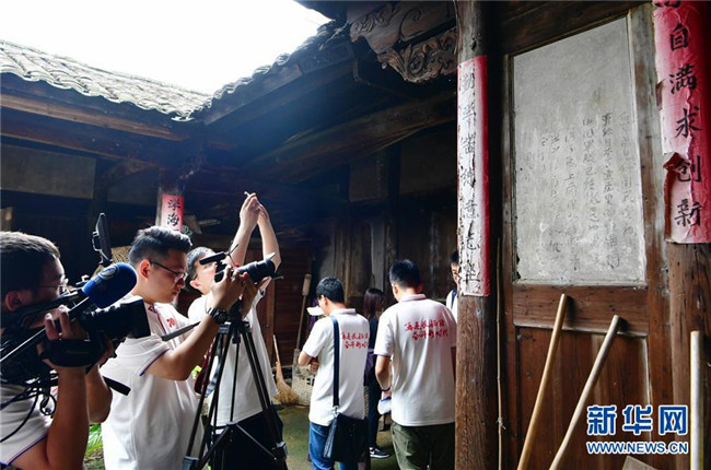 6月17日,在長汀縣南山鎮(zhèn)中復(fù)村觀壽公祠前,媒體記者在重溫當(dāng)年紅軍長征前的場景。 新華社記者魏培全攝