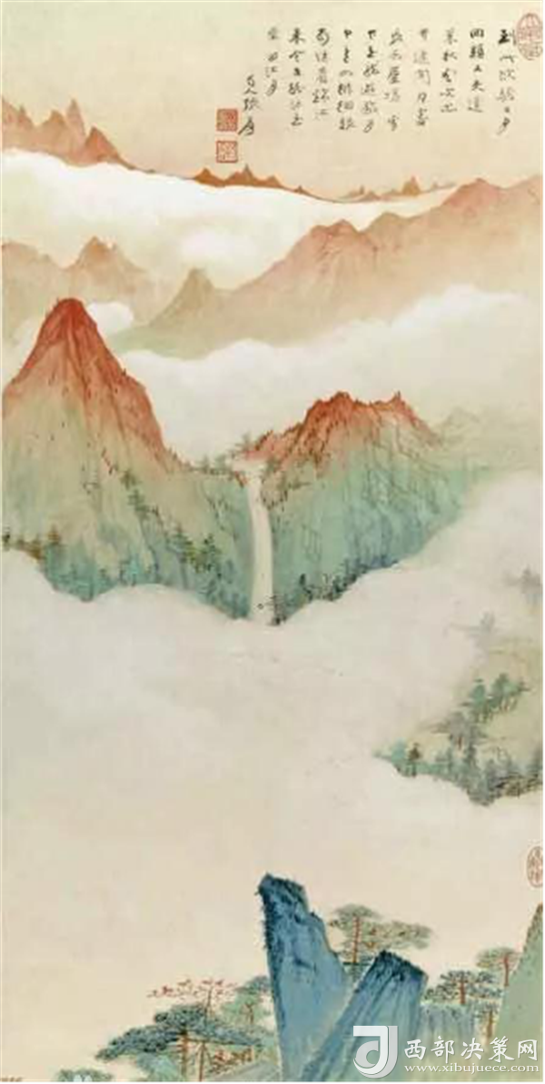 《華山云?!愤@幅山水畫是由中國(guó)著名山水畫家張大千先生創(chuàng)作,該幅山水畫作品圖也是畫家作品當(dāng)中出類撥萃的的精品之一,描繪了華山旭日東升的云海。