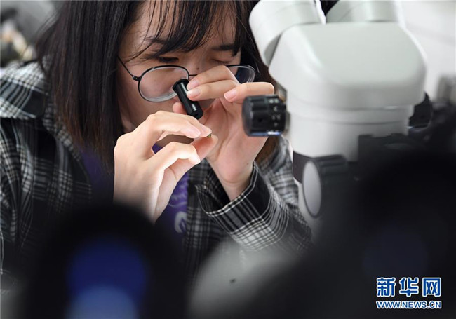 在長安大學珠寶鑒定實驗室,地質學專業(yè)寶玉石學與珠寶鑒定方向的學生在觀測樣本(5月28日攝)。新華社記者張博文攝