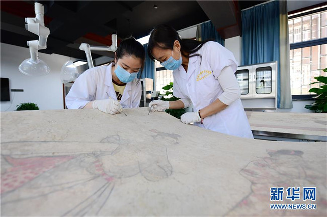在洛陽市文物考古研究院,西北大學文物保護技術專業(yè)學生田丹玉(左)和壁畫修復師田玉娥清理一件唐代壁畫(5月22日攝)。新華社記者李一博攝