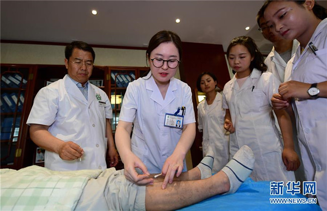 在陜西中醫(yī)藥大學附屬醫(yī)院名醫(yī)館,針灸推拿學專業(yè)學生王娟(左二)在教授雷正權的指導下練習針刺(6月4日攝)。新華社記者李一博攝