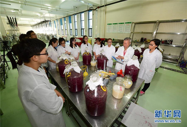 西北農林科技大學葡萄與葡萄酒工程專業(yè)學生在葡萄酒釀造課上聽取李華教授(右二)講解注意事項(2017年9月7日攝)。新華社記者邵瑞攝