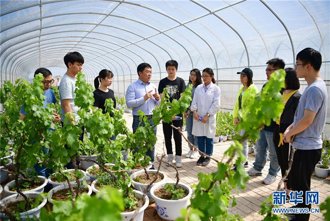 西北農林科技大學葡萄酒學院院長房玉林(左四)在為該院學生講解葡萄種植(5月24日攝)。新華社記者邵瑞攝