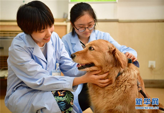 西北農林科技大學動物醫(yī)學專業(yè)學生在學校的動物醫(yī)院內安撫一只寵物狗(5月25日攝)。新華社記者邵瑞攝