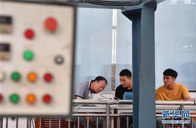 在西北工業(yè)大學航海學院消聲水池實驗室,教師張爭氣(左一)正在指導學生進行測量實驗(6月17日攝)。新華社記者張博文攝