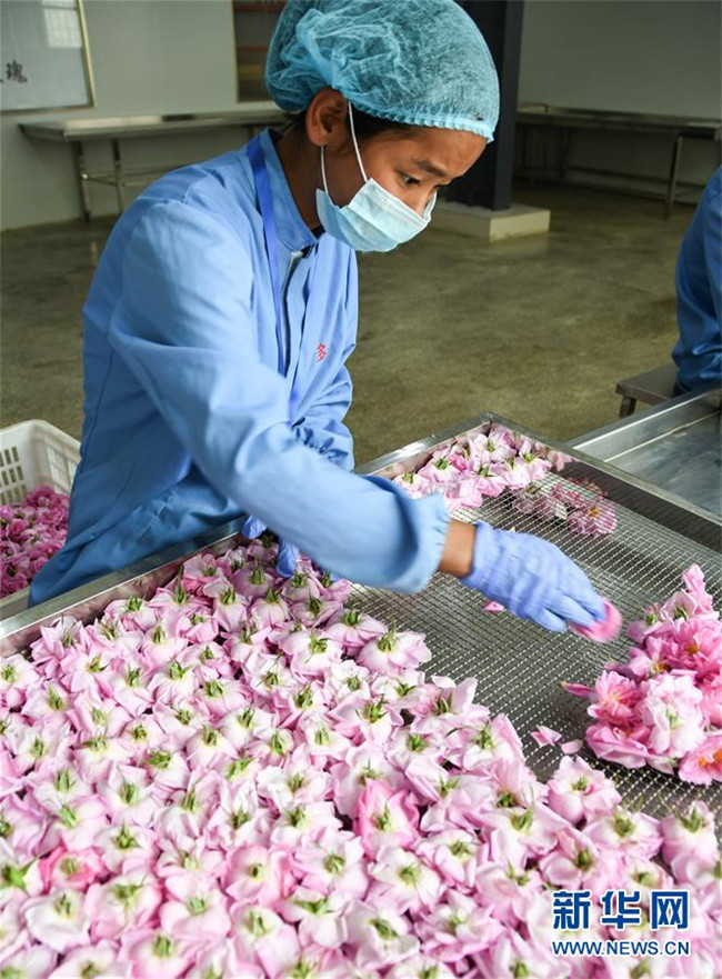 6月26日,在四川省小金縣清多香玫瑰種植專業(yè)合作社,工人準(zhǔn)備將玫瑰烘干。新華社記者 高健鈞 攝