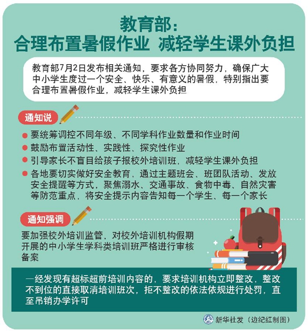 暑假將至,教育部2日發(fā)布相關通知,要求各方協(xié)同努力,確保廣大中小學生度過一個安全、快樂、有意義的暑假,特別指出要合理布置暑假作業(yè),減輕學生課外負擔。