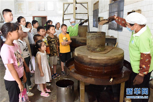 7月2日,安徽省銅陵市大通鎮(zhèn)中心學校學生在暑期社會實踐活動中參觀大通小磨麻油制作過程。 新華社發(fā)(過仕寧 攝)