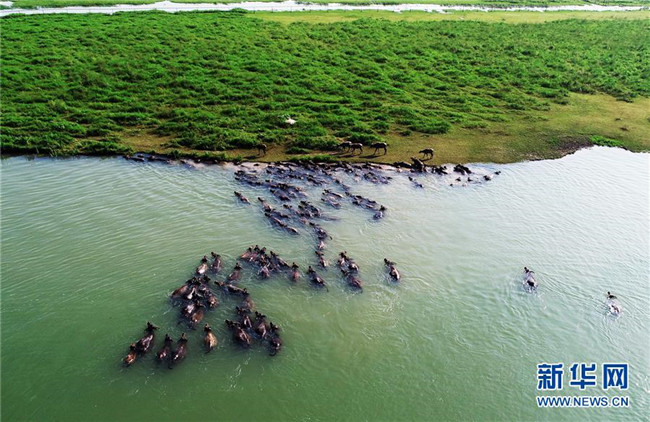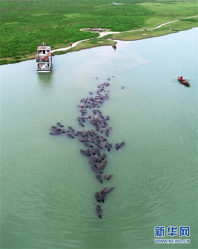 7月2日傍晚,在四川省南充市蓬安縣油房溝村,百余頭水牛橫渡嘉陵江歸欄(無人機(jī)拍攝)。新華社發(fā)(劉永紅攝)