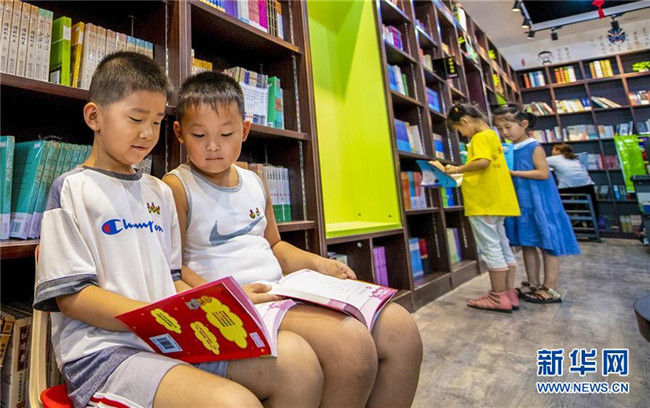 7月9日,孩子們?cè)诤颖笔『馑形湟乜h新華書(shū)店閱讀圖書(shū)。新華社記者 李曉果 攝