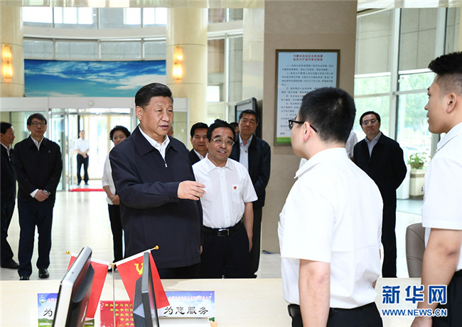 7月15日至16日,中共中央總書記、國家主席、中央軍委主席習近平在內蒙古考察并指導開展“不忘初心、牢記使命”主題教育。這是16日上午,習近平在內蒙古自治區(qū)自然資源廳自然資源政務大廳同工作人員交談,了解開展主題教育和落實便捷高效政務服務等情況。 新華社記者 謝環(huán)馳 攝