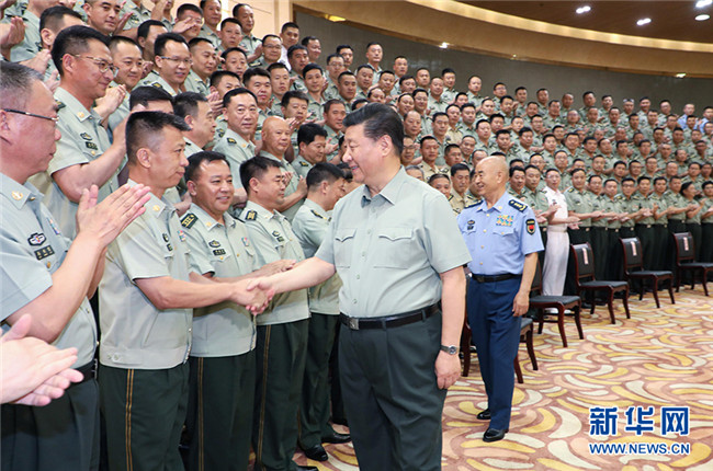 7月15日至16日,中共中央總書記、國家主席、中央軍委主席習近平在內蒙古考察并指導開展“不忘初心、牢記使命”主題教育。這是16日上午,習近平在呼和浩特親切接見駐內蒙古部隊副師職以上領導干部和團級單位主官,代表黨中央和中央軍委向駐內蒙古部隊全體官兵致以誠摯問候。 新華社記者 李剛 攝