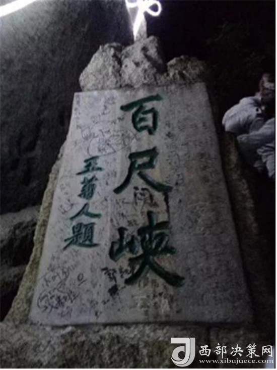 第一道險關(guān)是千尺幢。未到千尺幢,先到“回心石”。游人走到這里,往前一看,到處是危崖峭壁,不覺望而生畏,有很多就不敢往前走了,“回心石”由此得名。