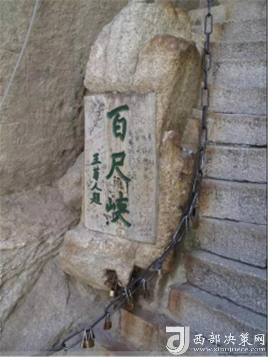 第二道險關(guān)是百尺峽。這里兩壁高聳,中間夾著一塊從天而降的巨石,上刻“驚心石”三個大字,游人從石下小路穿過,確實驚心動魄。第三道險關(guān)是老君犁溝,這是夾在陡峭石壁之間的一條溝狀險道,有570多個石階。相傳這里原先根本沒有路,太上老君見了,就將手中的如意柄變成一張鐵犁, 又牽來青牛,一夜間犁成了這條山溝。傳說青牛犁完溝后,見華山景色壯美,便化為石牛,永遠(yuǎn)地留在了華山之上。溝的盡頭是一道陡壁, 名為“猢猻愁”。顧名思義,連猴子都發(fā)愁,可見這里的山勢多么陡峭。