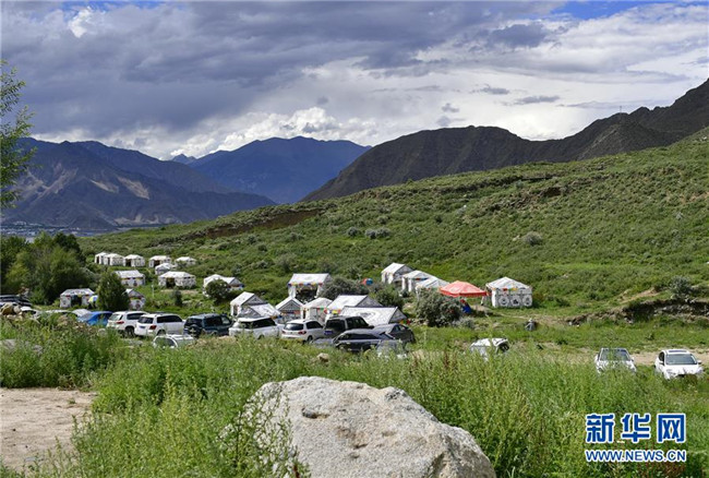 這是達東村景區(qū)的帳篷和旅游車輛(7月20日攝)。西藏拉薩市柳梧鄉(xiāng)達東村是一個千年古村,也曾是一個貧困村。近年來,依托秀美的自然風(fēng)光、深厚的歷史文化和淳樸的風(fēng)土人情,當(dāng)?shù)卣畬嵤┪幕糜萎a(chǎn)業(yè)精準扶貧,使達東村蛻變成為鄉(xiāng)村旅游勝地。新華社記者張汝鋒攝