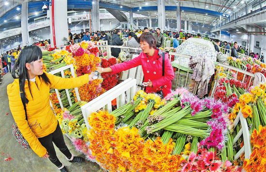 云花是云南省一張亮麗的名片。2018年,云花總產(chǎn)值達(dá)到525.9億元,40多萬(wàn)從業(yè)者參與到這份美好的事業(yè)中,成為脫貧致富和全面建成小康社會(huì)的重要產(chǎn)業(yè)力量。圖為斗南花市上忙碌的賣(mài)花人。(記者黃喆春攝)