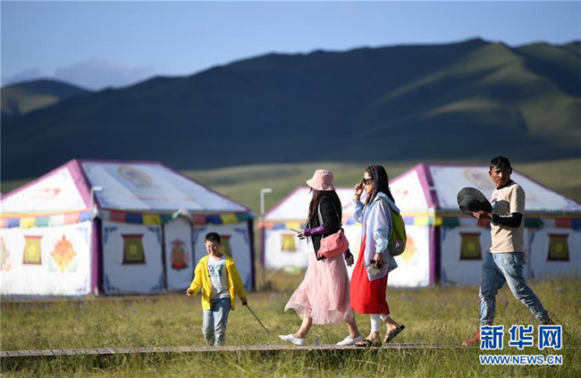 游客在甘肅省甘南藏族自治州碌曲縣尕海鎮(zhèn)尕秀村帳篷城度假區(qū)游玩(2018年8月10日攝)。新華社記者 陳斌 攝