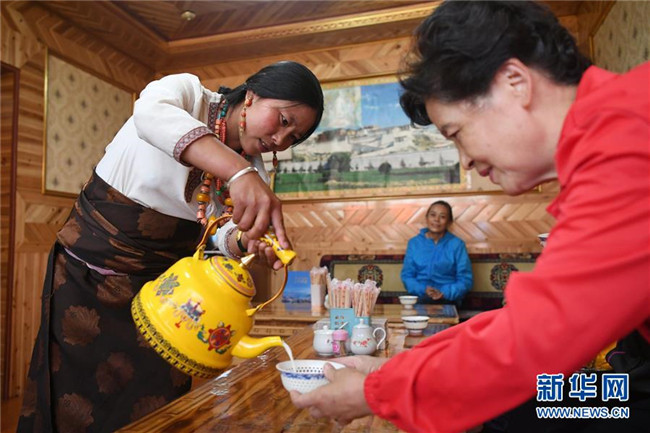 甘肅省甘南藏族自治州碌曲縣尕海鎮(zhèn)尕秀村村民扎西拉毛(左)在自家的牧家樂(lè)里為游客倒奶茶(2018年8月10日攝)。新華社記者 陳斌 攝