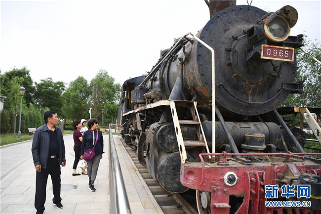 游客在甘肅省白銀市火焰山國(guó)家礦山公園內(nèi)參觀蒸汽機(jī)車(2019年6月11日攝)。新華社記者 陳斌 攝