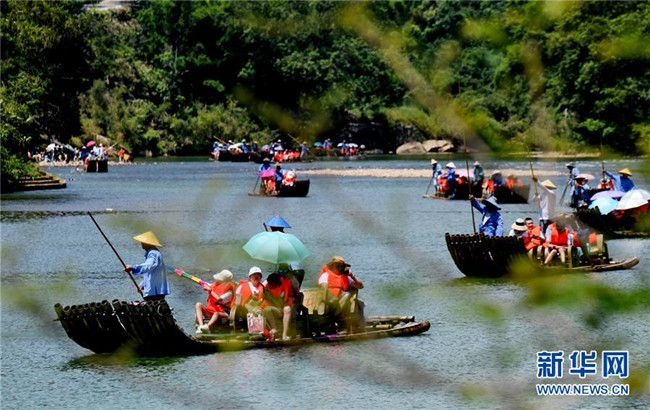 盛夏的福建武夷山,正值暑期旅游高峰,游客乘竹筏沿九曲溪漂流而下,欣賞沿岸美麗風(fēng)光。
