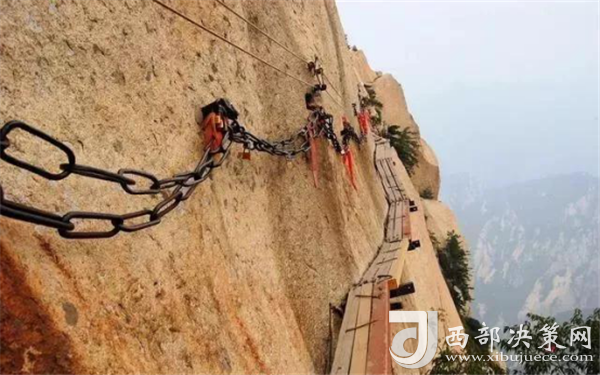在萬仞絕壁上鑲嵌石釘搭木椽而筑,棧道上下皆是懸崖絕壁,鐵索橫懸,游人至此,面壁貼腹,屏氣挪步,被譽為“華山第一天險”。