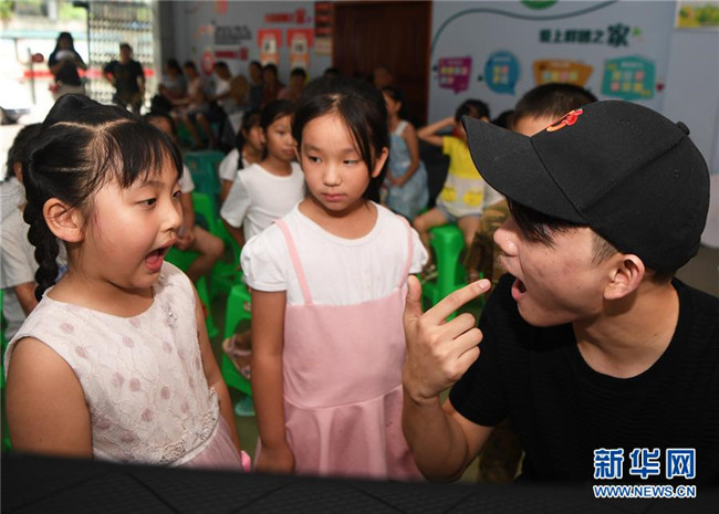 8月5日,培訓(xùn)班老師(左)在課堂上與小朋友們互動。新華社記者 王全超 攝