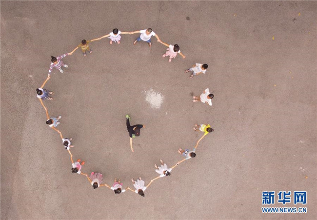8月5日,參加音樂培訓(xùn)班的小朋友們和老師一起在課間做游戲(無人機拍攝)。 新華社記者 王全超 攝