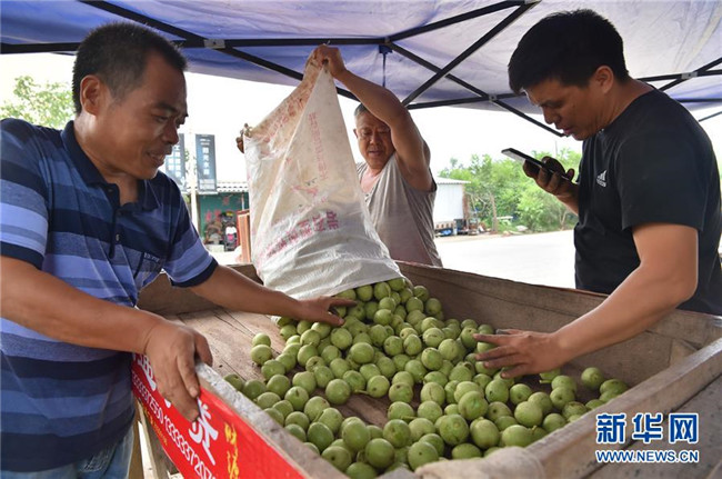 8月5日,在贊皇縣的核桃銷售點(diǎn),核桃種植戶將核桃賣給經(jīng)銷商。