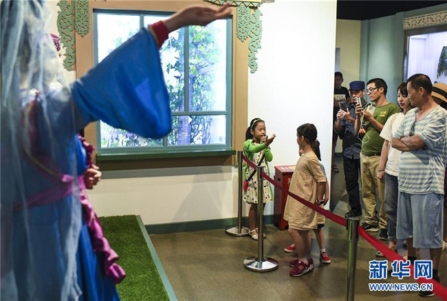 文藝揚(yáng)(右)在新疆博物館民俗展廳中為游客做講解(8月8日攝)。 新華社記者 王菲 攝