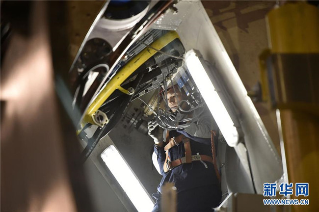 工人在沈陽北方重工集團(tuán)一部在造的掘進(jìn)機(jī)內(nèi)部作業(yè)(2016年12月7日攝)。新華社記者 姚劍鋒 攝