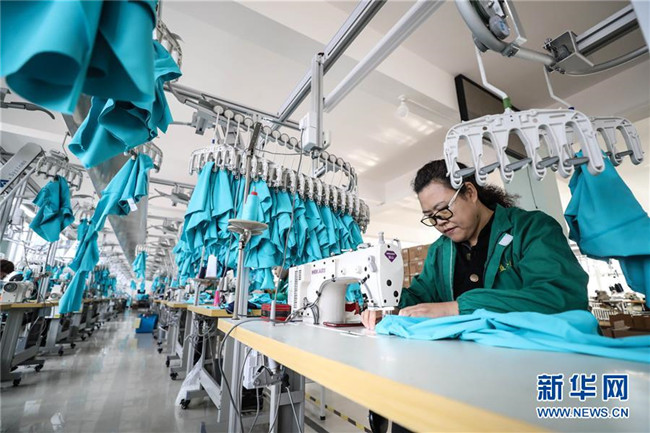 3月6日,工人在葫蘆島益豐(集團(tuán))運(yùn)動(dòng)服飾有限公司生產(chǎn)車間加工泳衣。新華社記者 潘昱龍 攝