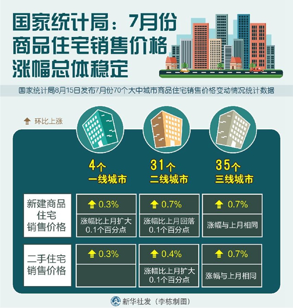 國家統(tǒng)計(jì)局15日發(fā)布7月份70個大中城市商品住宅銷售價格變動情況統(tǒng)計(jì)數(shù)據(jù)。統(tǒng)計(jì)顯示,7月份,商品住宅銷售價格漲幅總體穩(wěn)定。從同比看,一二三線城市新建商品住宅和二手住宅銷售價格同比漲幅不同程度回落,或與上月相同。