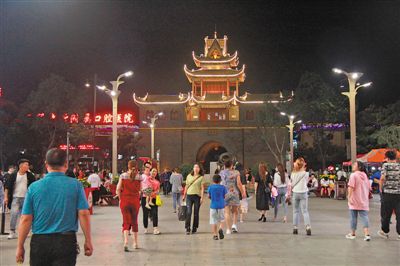 華燈初上,北面的小廣場上大媽們繞圈疾步鍛煉身體,小孩騎著滑輪車嬉戲玩耍,年輕人打著羽毛球,古老建筑同現(xiàn)代氣息融合在一起,也是一種特色。