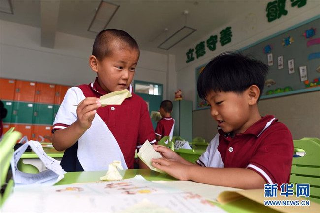 8月29日,一年級新生許加甄(左)和王淇在課間疊紙飛機。新華社記者 林宏 攝