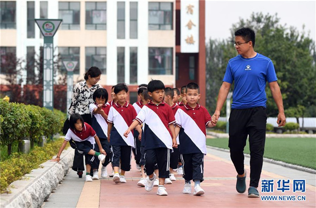 8月29日,體育老師宋陽(右)帶領一年級新生班同學前往體育館。 新華社記者 林宏 攝