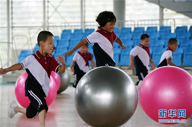 8月29日,一年級新生班的同學在體育課上玩瑜伽球。 新華社記者 林宏 攝