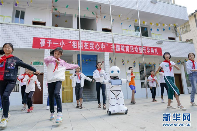 9月2日,在城口縣蓼子鄉(xiāng)第一中心小學開學典禮上,機器人老師和孩子們一起跳舞。 新華社記者 劉潺 攝