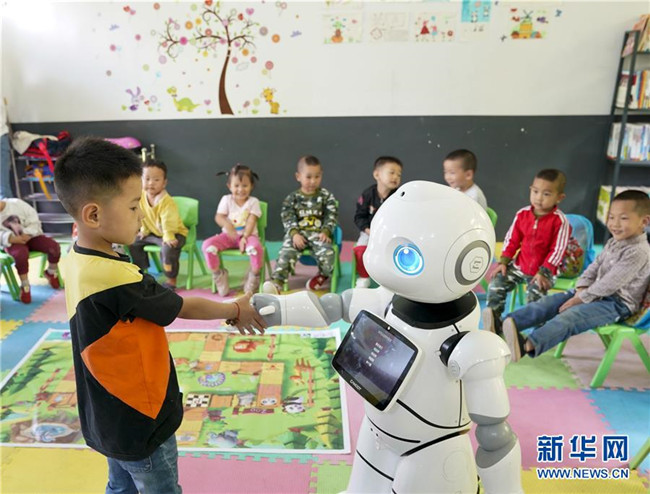9月2日,在城口縣蓼子鄉(xiāng)第一中心小學附屬的鄉(xiāng)村小學蓮花小學開學典禮上,機器人老師在和鄉(xiāng)村小學的孩子進行互動交流。新華社記者 劉潺 攝