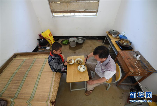在廣西都安瑤族自治縣菁盛鄉(xiāng)義德小學(xué)弄豆教學(xué)點(diǎn),藍(lán)啟飛老師和學(xué)生藍(lán)孟源一起吃午餐(2015年4月15日攝)。當(dāng)時(shí),藍(lán)啟飛是這所學(xué)校唯一的老師,藍(lán)孟源是這所學(xué)校唯一的學(xué)生。新華社記者 陸波岸 攝