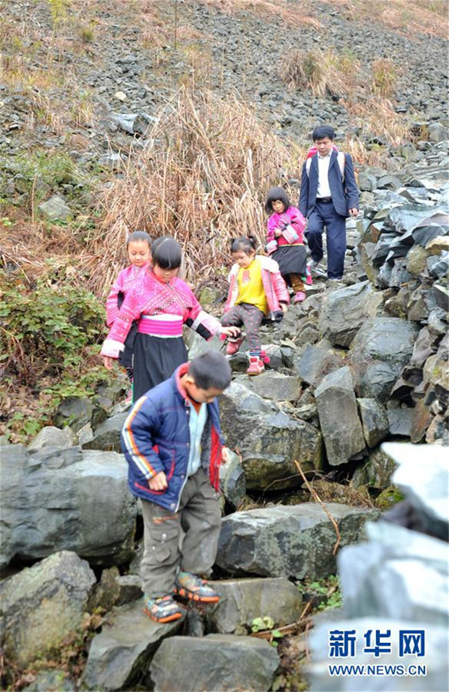 在廣西龍勝各族自治縣龍脊鎮(zhèn)江柳村,翁江教學(xué)點(diǎn)老師余啟貴和學(xué)生一起走在去學(xué)校的路上(2013年2月26日攝)。新華社記者 陸波岸 攝