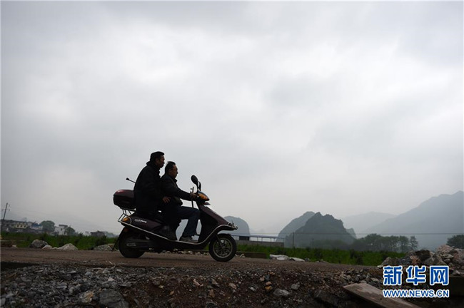 在廣西灌陽(yáng)縣洞井瑤族鄉(xiāng),桂平巖小學(xué)老師趙仁斌(前)用電單車將楊大杰老師載去學(xué)校的路上(2016年3月24日攝)。2015年3月,楊大杰被診斷為股骨頭壞死,經(jīng)過(guò)一段時(shí)間治療病情有所緩解后,他堅(jiān)持帶病回到教學(xué)崗位上。新華社記者 陸波岸 攝