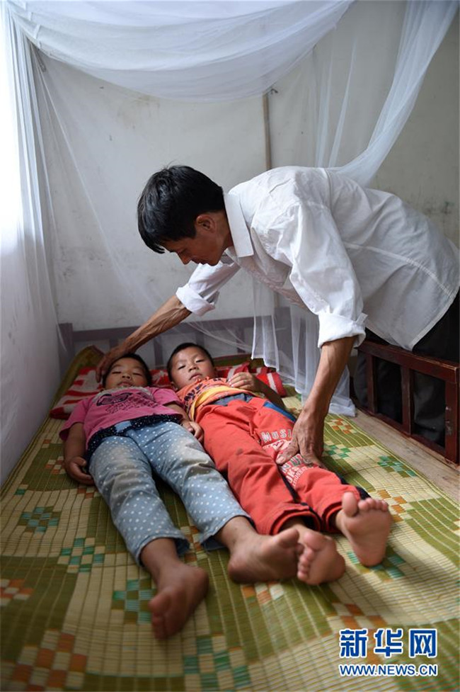 在廣西東蘭縣三石鎮(zhèn)泗爺小學(xué),黃英雄老師在照顧學(xué)生睡午覺(jué)(2014年9月10日攝)。新華社記者 陸波岸 攝