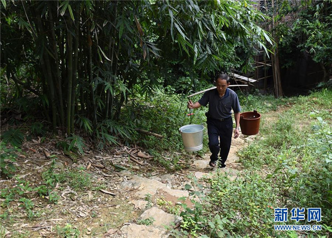 在廣西天等縣進(jìn)結(jié)鎮(zhèn)愛(ài)樂(lè)村龍坡屯,龍坡教學(xué)點(diǎn)老師黃明料在教學(xué)點(diǎn)附近農(nóng)家挑水回學(xué)校給學(xué)生做午飯(2015年9月10日攝)。新華社記者 陸波岸 攝