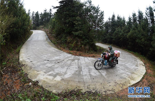 在廣西灌陽(yáng)縣洞井瑤族鄉(xiāng),野豬殿村小學(xué)老師周運(yùn)雄在采購(gòu)學(xué)生營(yíng)養(yǎng)餐食材后騎行在回學(xué)校的路上(2016年3月23日攝)。新華社記者 陸波岸 攝