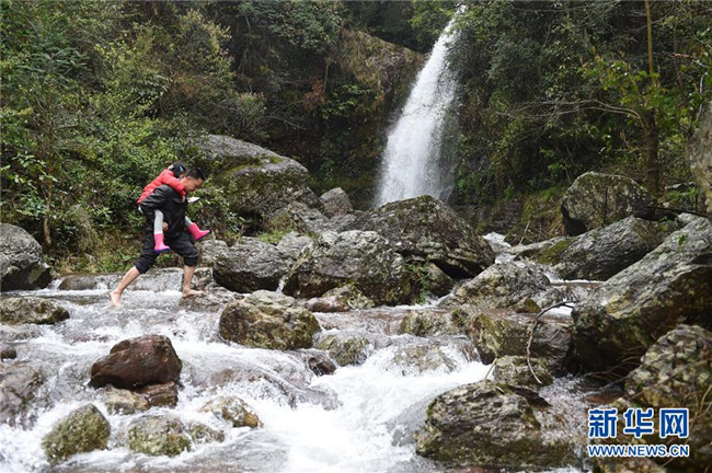 在廣西灌陽(yáng)縣洞井瑤族鄉(xiāng)野豬殿村,野豬殿村小學(xué)老師周運(yùn)雄放午學(xué)后背著一名學(xué)生走過(guò)被流水淹沒(méi)的路段回家(2016年3月22日攝)。新華社記者 陸波岸 攝